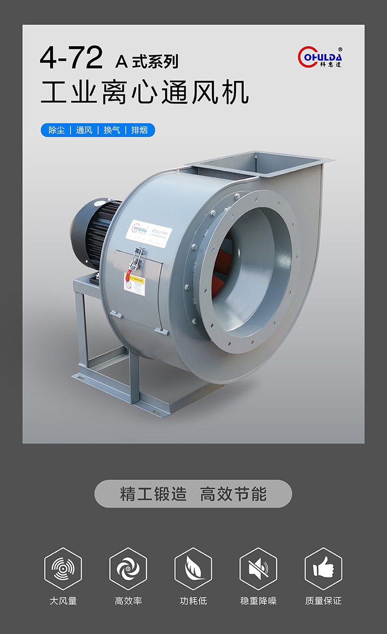 4-72-A式属中压大流离心通风机,相对于旧型风机具有较高效率、较低噪音、压力曲线平稳、使用范围广特点,主要用于厂矿企业、各类宾馆、酒楼集中空调系统气体输送、厨房排气以及地下室、影剧院、会议室、体育馆、商场等大型建筑的室内通风换气、降温除尘等用途,也可以与其他各类机械设备配套作气体循环使用。